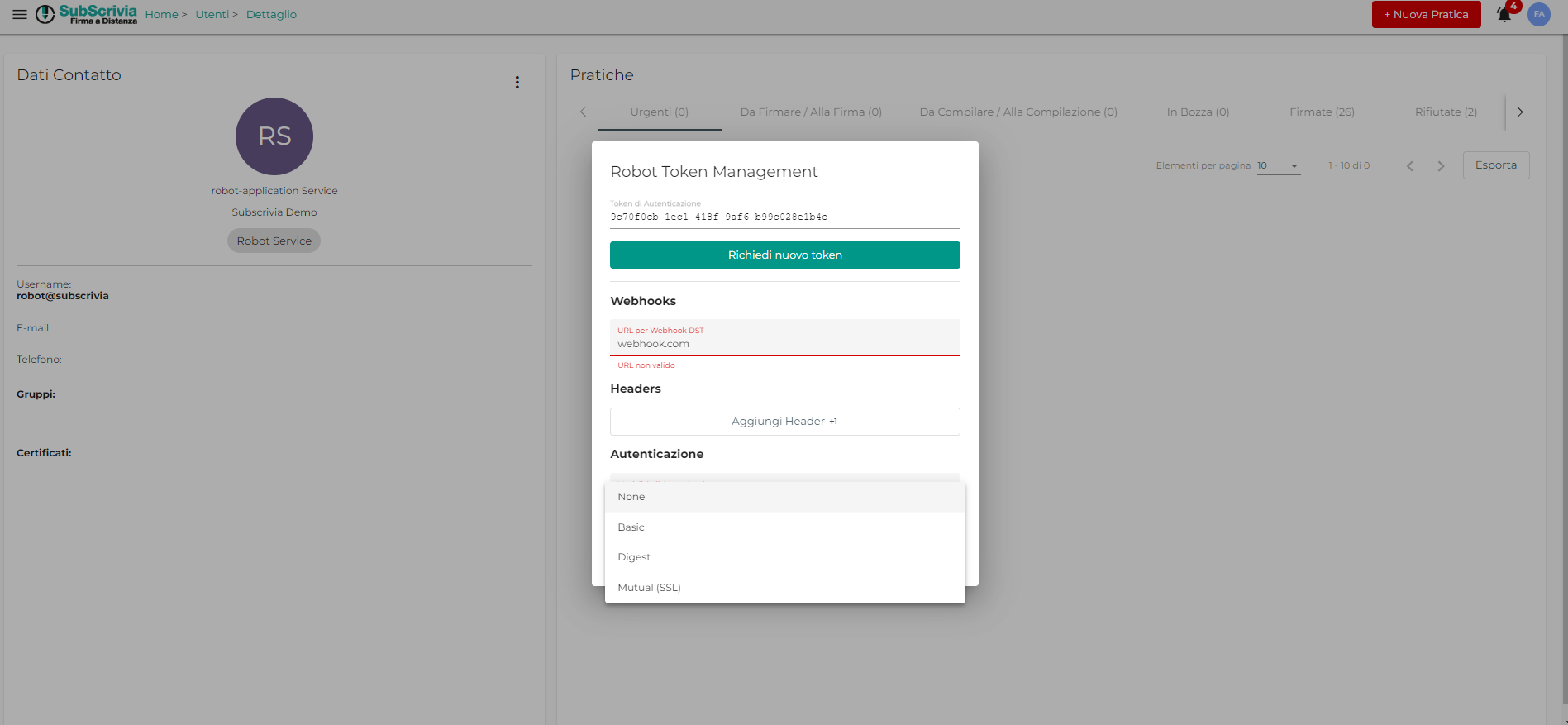 The Webhooks field of the Robot configuration represents the URL associated to the server able to listen for notifications, which will be sent by Subscrivia as POST requests, with JSON-type payload, about DST and signature status.