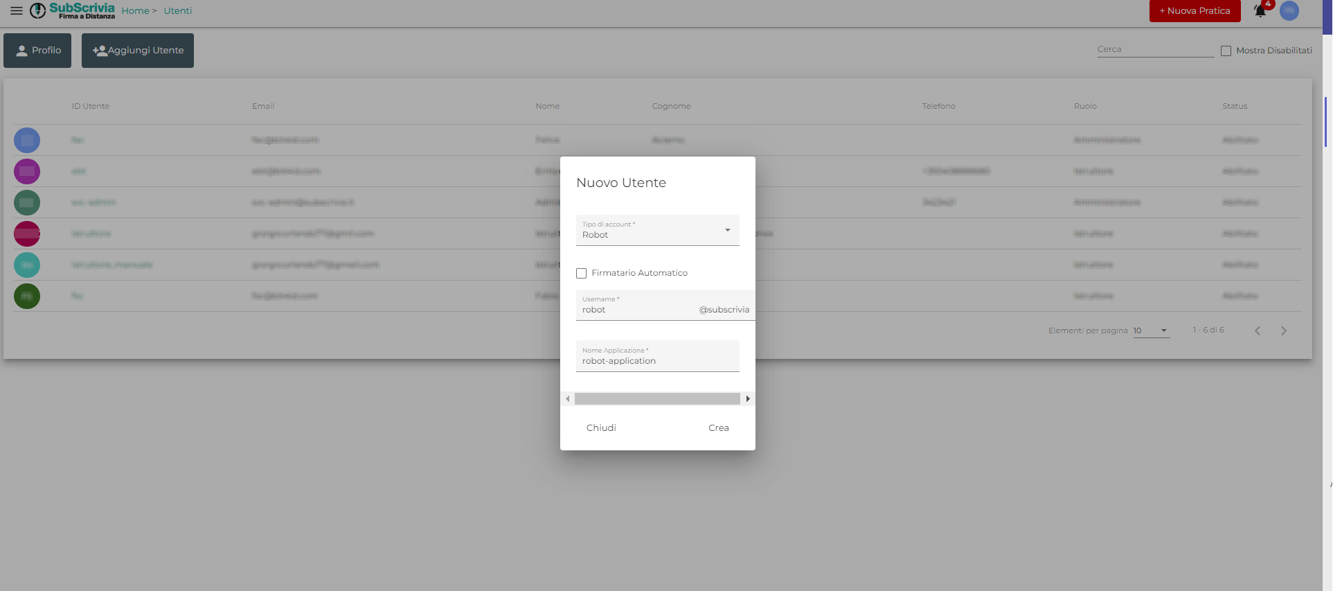 To obtain the robot user's token you have to access to Subscrivia, then click on the burger menu and select Utenti.
