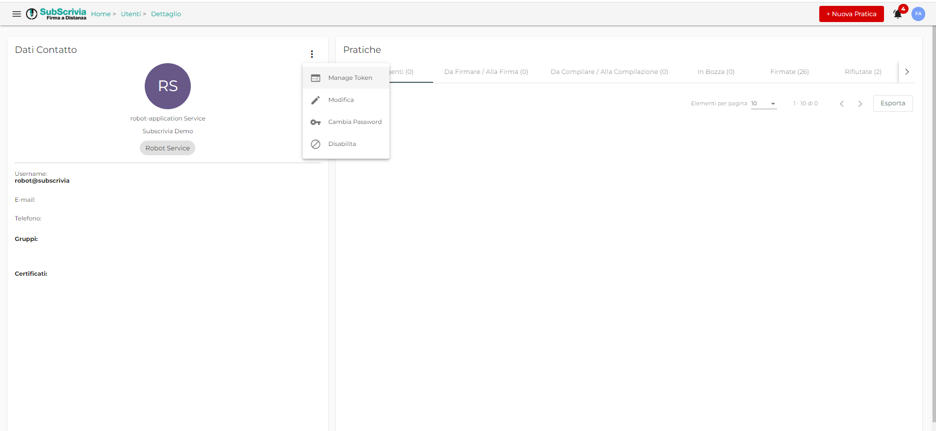 To obtain the robot user's token you have to access to Subscrivia, then click on the burger menu and select Utenti.